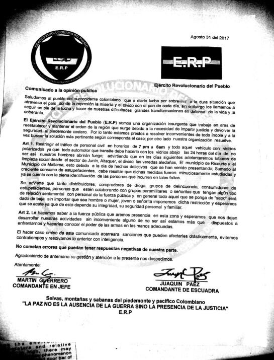 Un presunto grupo que se hace llamar 'Ejercito del pueblo' es el autor de un panfleto, en el que se intimida a la comunidad de Piedemonte Costero e impone restricciones a la movilidad entre las 7 de la noche y las seis de la mañana.