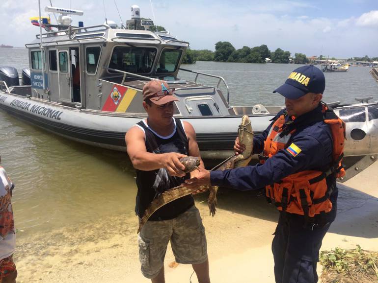 Una unidad de la Armada Nacional, gracias al llamado de la comunidad, logró la recuperación de dos especies protegidas, que al parecer serían sacrificadas por personas inescrupulosas, en el corregimiento de Caño del Oro, en Cartagena.