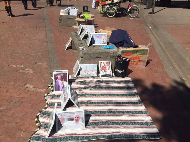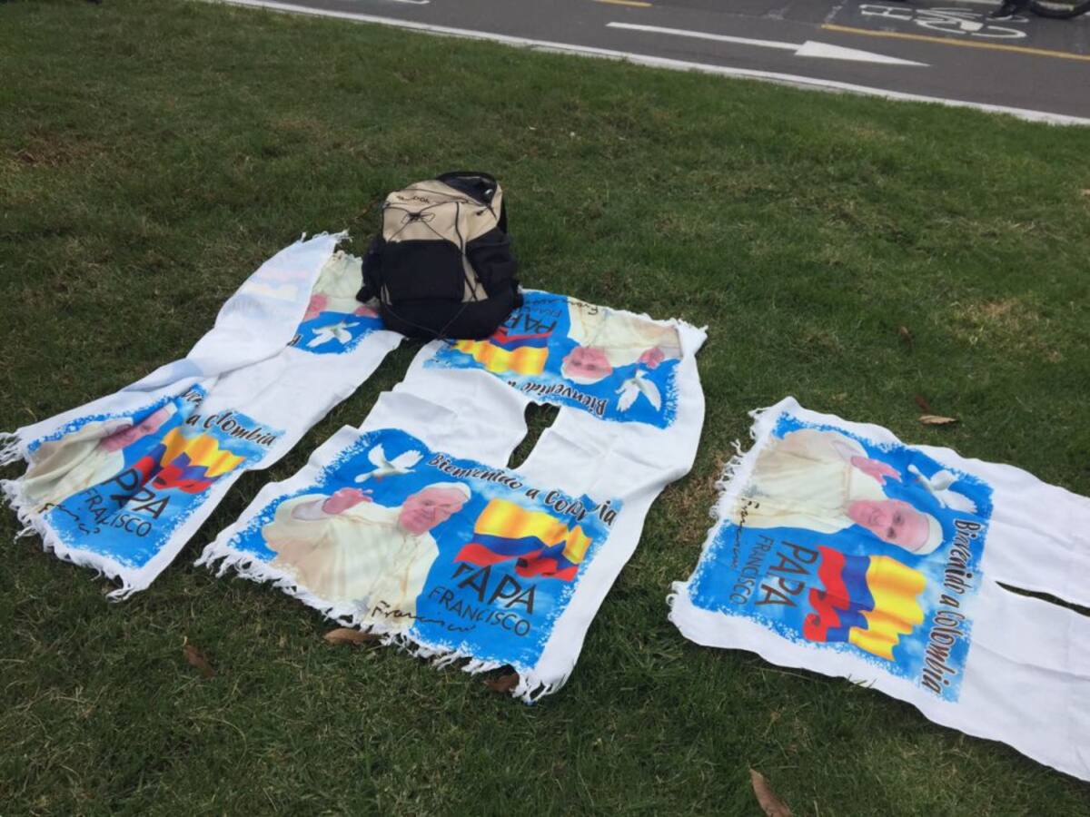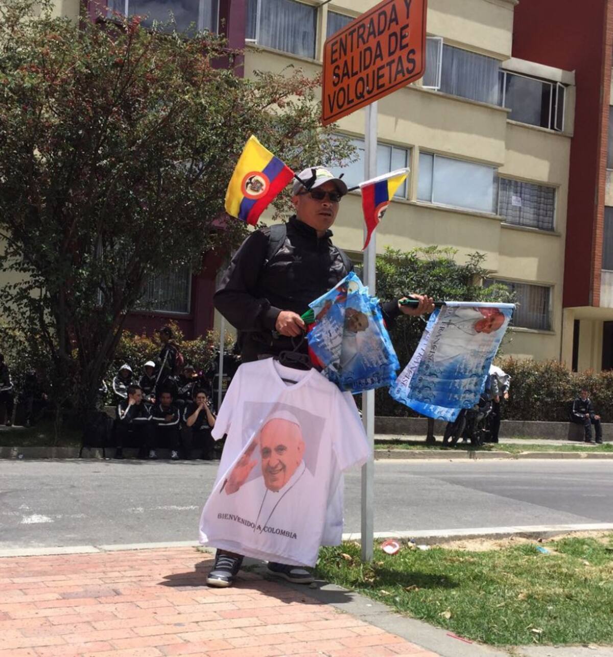 Varios productos relacionados con la visita del papa Francisco se ven en las calles de Bogotá.
