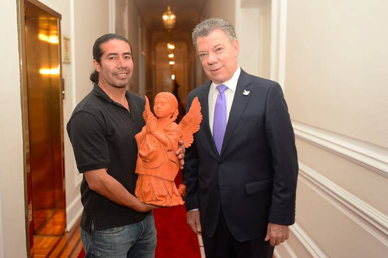 Por segunda vez un artesano de Ráquira (Boyacá), le entregó a la primera dama María Clemencia Rodríguez de Santos una escultura en honor a los niños campesinos víctimas del conflicto armado colombiano.