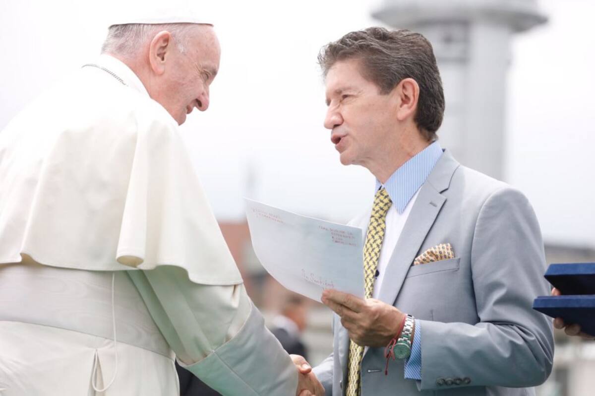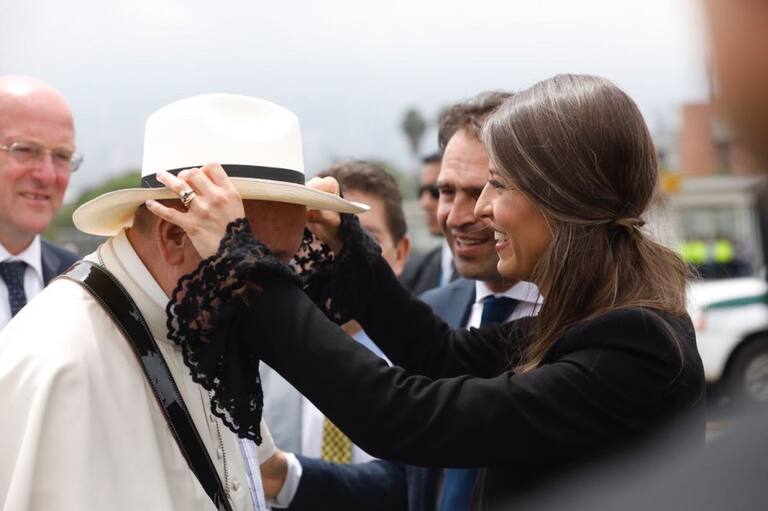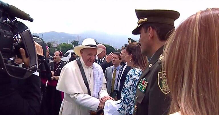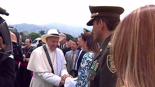 Con el poncho, carril y riel, el papa Francisco saludo a las autoridades de Medellín.