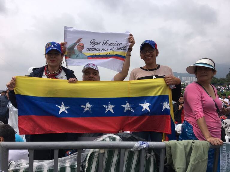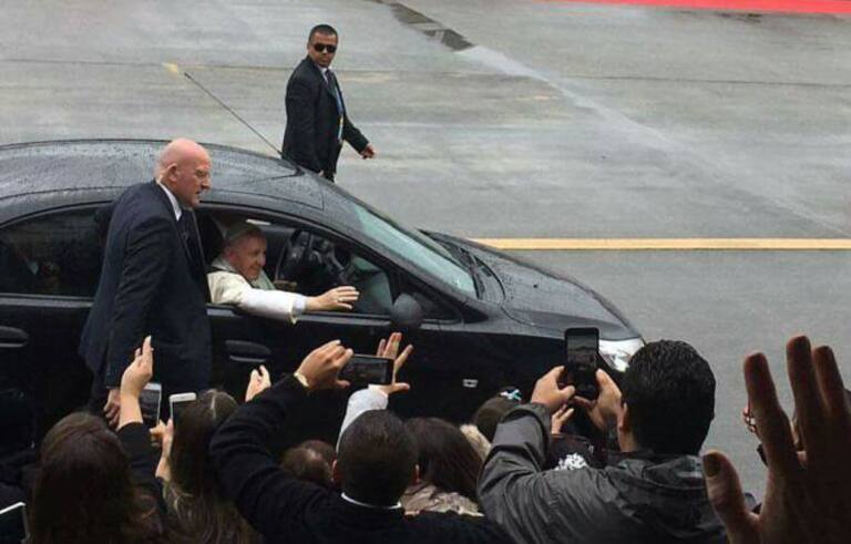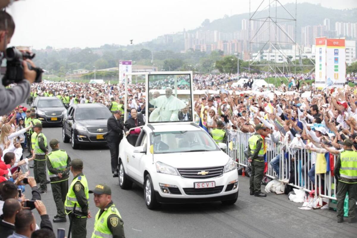Durante su entrada al Aeropuerto Olaya Herrera el papa Francisco se subió su papa móvil y visito a miles de feligreses.