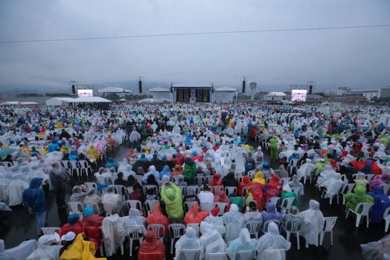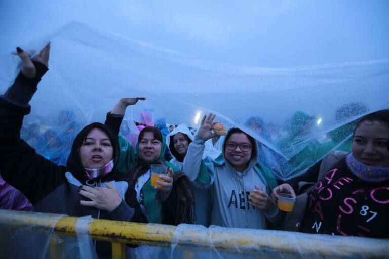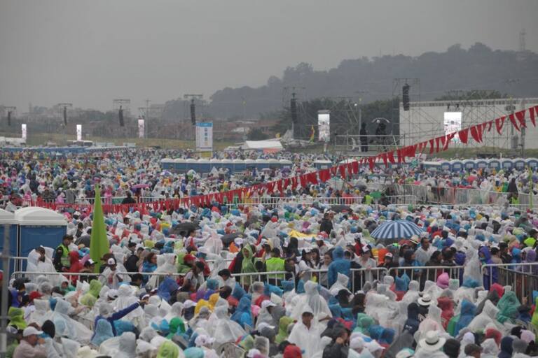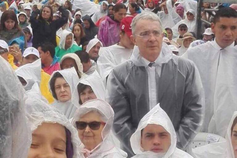 El senador Álvaro Uribe Vélez, al igual que todos los asistentes, espero el aguacero por ver al papa Francisco,