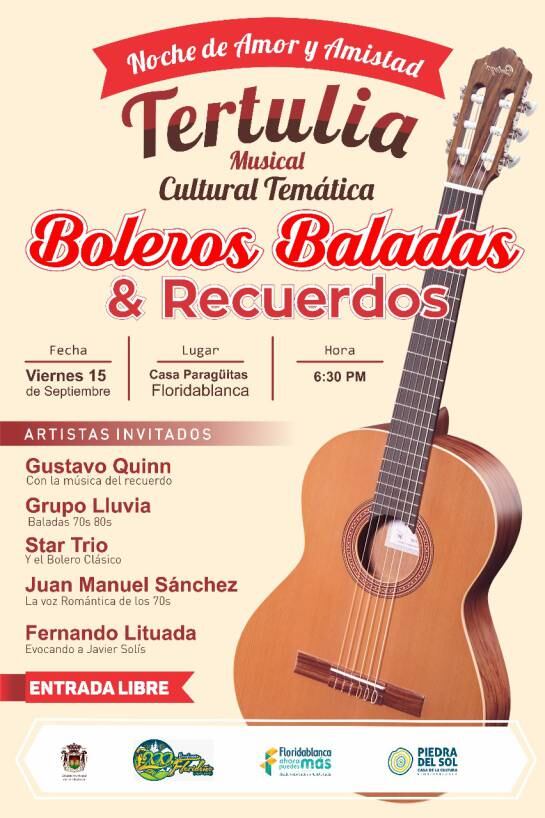 En el marco de la conmemoración del bicentenario de su fundación, la Casa de la Cultura Piedra del Sol presentará la tertulia musical cultural temática 'Boleros, baladas y recuerdos'. El evento se realizará en la Casa Paragüitas el próximo viernes 15 de septiembre a partir de las 6:30 pm.