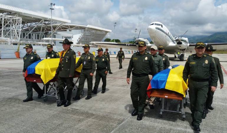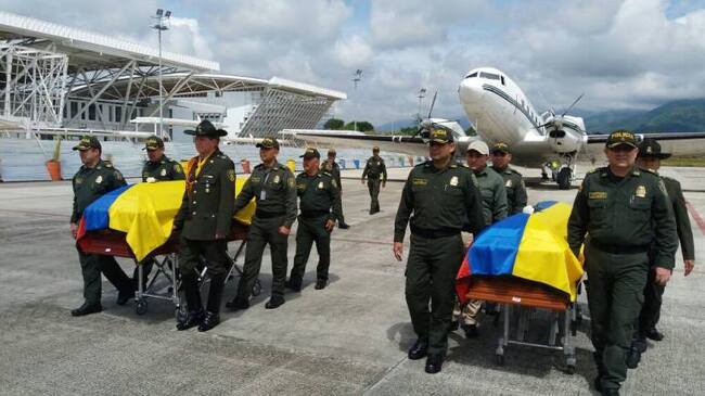 En la pista del aeropuerto Perales de Ibagué, la Policía en esta zona del país, recibió con honores a los dos uniformados que murieron tras una emboscada perpetrada por un comando del Ejército de Liberación Nacional en el departamento del Cauca.