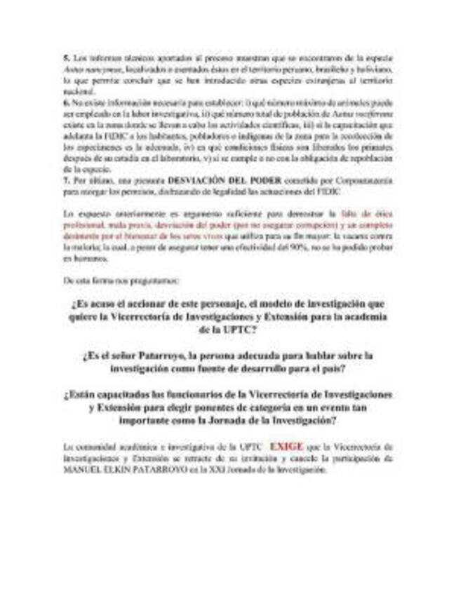 Agregó la investigadora que el científico “no es del todo idóneo para hablar del papel sobre la investigación científica. Nos suscita desconfianza la presunta participación del doctor Patarroyo en la desviación del poder en complicidad con Corpoamazonía, los cuales disfrazaban de legalidad los actos de la Fundación, y no podemos permitir que se tenga como modelo de investigación a una persona que aparentemente estaría pasando por encima de la ley para cumplir sus objetivos. Las investigaciones tienen que seguir estrictamente los protocolos de ética profesional y bioética, impartidos desde la educación superior”.