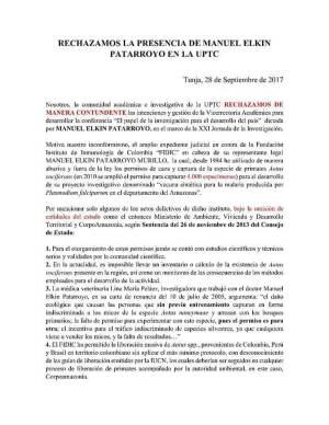 La Bióloga de Albaluz Ramos, especialista en derecho ambiental e investigadora de la Universidad Pedagógica y Tecnológica de Colombia, UPTC, dijo en Caracol Radio que “la ovación que le hacen al doctor Manuel Elkin es una completa ofensa a las actuaciones de los investigadores. Las actuaciones del instituto del doctor Patarroyo, no representan la ética profesional ni los métodos de investigación de la UPTC, y aunque la conferencia se realice de todos modos, rechazamos que lo hayan traído a un espacio de discusión y debate tan importante, por cuenta de la vicerrectoría de investigaciones y extensión”.