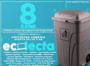 Ecolecta, así fue denominada la jornada ambiental que se cumplirá este domingo 8 de octubre en la ciudad de Armenia y que tiene como fin recolectar el mayor número de residuos especiales como celulares, pilas, computadores, videojuegos, televisores y otros elementos que requieren un tratamiento especial.