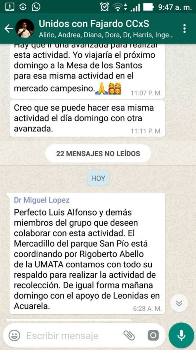 La denuncia efectuada en Caracol Radio se acompaña de pantallazos de un diálogo entre los participantes del grupo de whatsapp de la campaña de Fajardo. Miguel López, coordinador de las actividades del exgobernador, en Santander, dice que debe aprovecharse el mercadillo para recoger firmas lo que puede hacerse gracias al respaldo de Rigoberto Abello, un funcionario de la Umata.