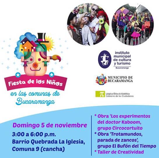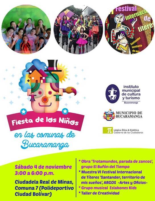 La Fiesta de los Niños en las Comunas de Bucaramanga continúa en los barrios Ciudadela Real de Minas de la comuna 7 y Quebrada la Iglesia de la comuna 9. El sábado 4 de noviembre la música y el teatro estará presente en el Polideportivo Ciudad Bolívar, con la obra teatral 'Trotamundos, parada de zancos' del grupos El Bufón del Tiempo. El grupo musical Eslabones Kids, dirigido por la maestra Zoraida Bernal, serán los encargados de las presentaciones musicales de la tarde de este sábado.