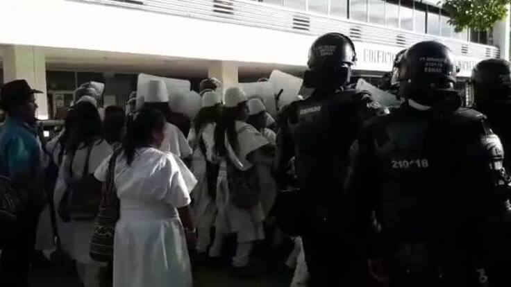 Unidades del Esmad de la Policía agredieron a indígenas arhuacos que bloquean desde el amanecer de este jueves 16 de noviembre, la entrada al edificio de la Gobernación del Cesar, incluyendo mujeres, ancianos y niños que se encontraban pacíficamente en la plazoleta de banderas.