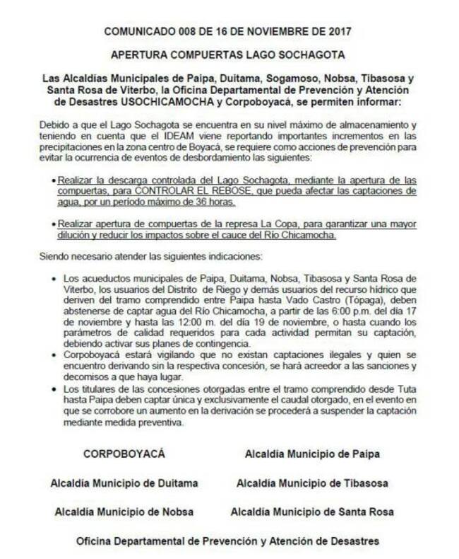 Por eso, los acueductos de Paipa, Duitama, Nobsa, Tibasosa y Santa Rosa de Viterbo, los usuarios del Distrito de Riego y demás usuarios del recurso hídrico que deriven del tramo comprendido entre Paipa hasta Vado Castro en Tópaga, deberán abstenerse de captar agua del río Chicamocha.