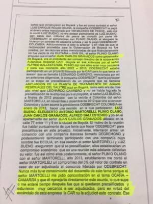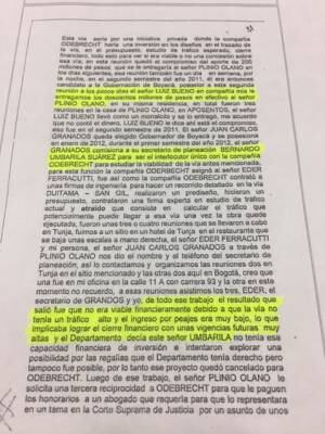 “El señor Olano referenció este apoyo que podía tener unas reciprocidades importantes para la compañía Odebrecht en el departamento de Boyacá que sería muy bueno hacer una reunión con el señor Juan Carlos Granados para que él pudiera explicar su plan de infraestructura denominado Maravillas de Boyacá”.