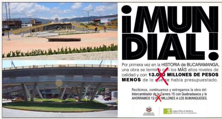 La administración local publicó avisos en los cuales se anunciaba, con gran bombo, que sobraron $13 mil millones, luego de la construcción del intercambiador de la avenida Quebradaseca con carrera 15.