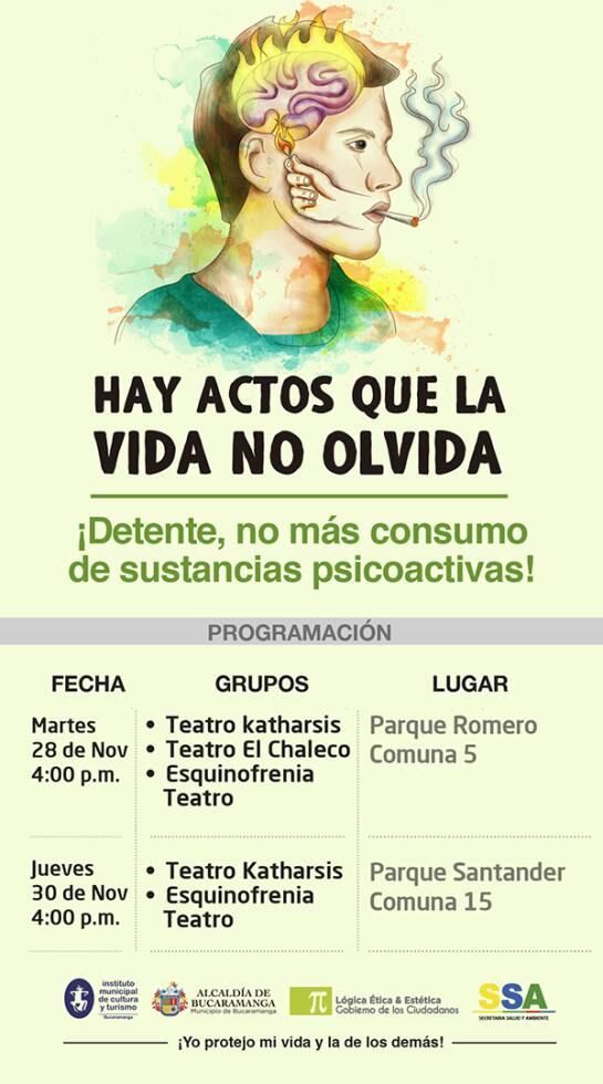 El proyecto, que comenzó el pasado 13 de septiembre, clausurará sus actividades con dos presentaciones teatrales en dos parques de la ciudad. Este martes, 28 de noviembre, en el Parque Romero de la comuna 5 se presentarán los grupos Teatro 'Katharsis', Teatro 'El Chaleco' y 'Esquinofrenia' Teatro. Para el jueves 30, último día de la campaña, los grupos Teatro 'Katharsis' y 'Esquinofrenia' se estarán presentando en el Parque Santander de la comuna 15.