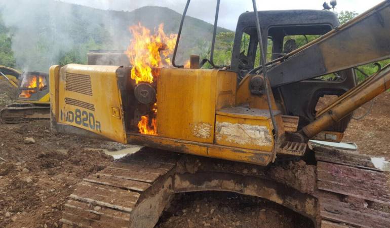 Las autoridades destruyeron dos máquinas retroexcavadoras y dos motores que utilizaban como dragas para la extracción de oro, avaluados en $800 millones en el municipio de Buenos Aires, departamento del Cauca.