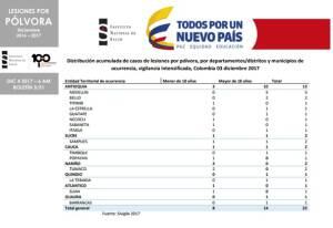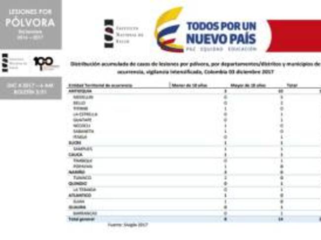 En la página del Instituto Nacional de Salud se reporta a fecha del 3 de diciembre 22 quemados con pólvora en todo el país, donde el departamento de Antioquía reporta 13 quemados, el departamento del Quindío también reporta un quemado con estos artefactos en el municipio de La Tebaida.