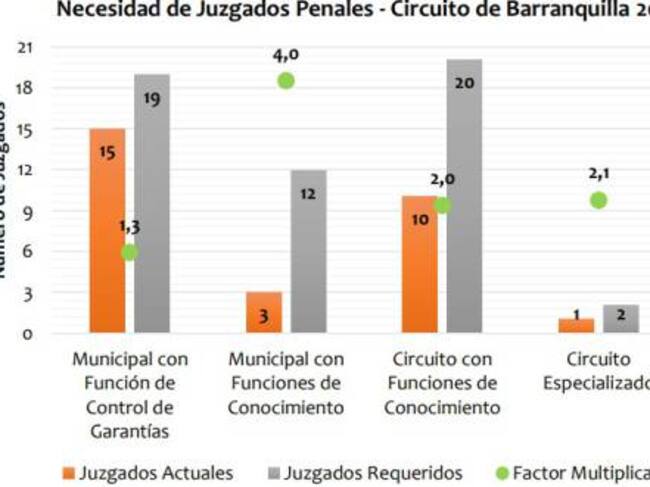 Entre las preocupaciones arrojadas en el informe se encuentra que en Barranquilla sólo funcionan 3 juzgados penales por cada 100 mil habitantes, cuando deberían haber por lo menos 12 y aumentar a 20 juzgados penales del circuito con funciones de conocimiento.