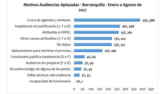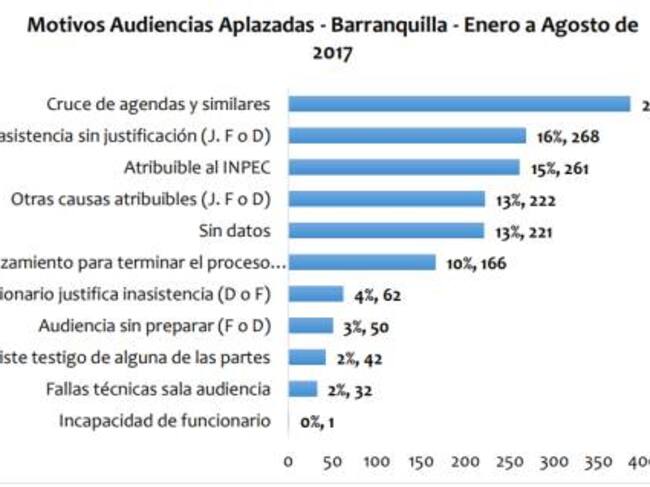 Solo en los primeros ocho meses del presente año se realizaron 532 audiencias de las 2.225 que se habían programado, situación presentada por diferentes factores entre las que se destacan simples ocupaciones de los administradores de justicia. Así lo reveló el más reciente diagnóstico de la operatividad del Sistema Penal Acusatorio en el Atlántico publicado por la Fundación Protansparencia.