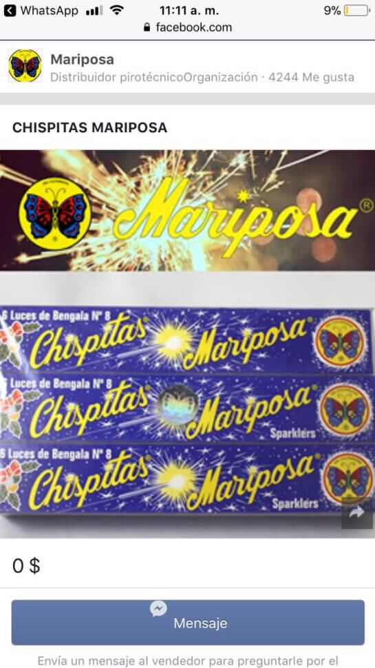 Caracol Radio se comunicó luego con una segunda empresa que también ofrece la pólvora por Facebook. Allí aseguraron qué elementos como las chispitas mariposa y los llamados volcanes no están prohibidos en Bogotá.