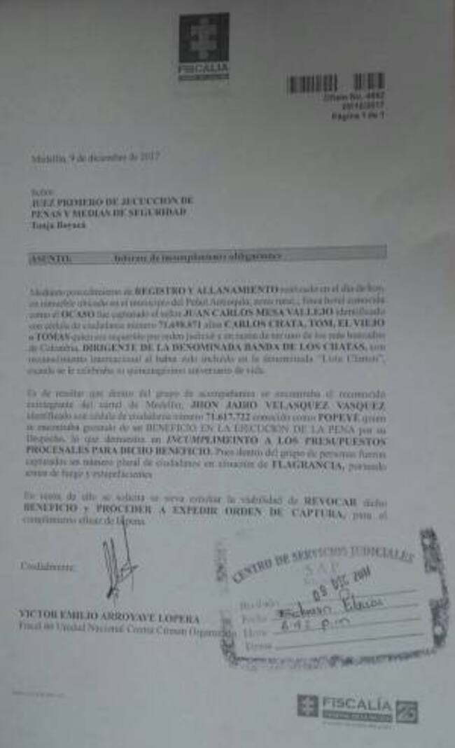 Este sábado la Fiscalía solicitó ante un juez de Tunja la revocatoria la libertad de Velásquez Vásquez, luego de que fuera encontrado con el hombre señalado de ser el principal cabecilla de “la Oficina”, la mayor estructura criminal de Medellín. Popeye estaba en la misma finca en la que se celebró el cumpleaños de Juan Carlos Mesa Vallejo, alias ‘Tom’ o ‘Carlos Chata’, por quien la justicia de Estados Unidos ofrecía una recompensa de 2 millones de dólares, al haber sido incluído en la lista Clinton.