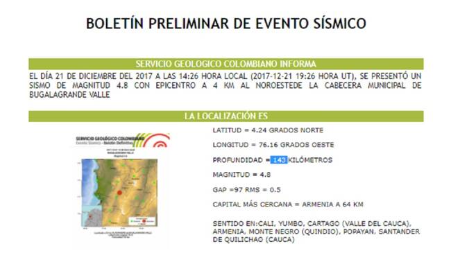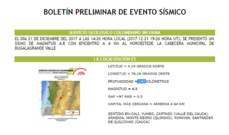 El movimiento, según el Sistema Geológico Colombiano, tuvo una intensidad de 4,8 grados en la escala sísmica y se presentó a las 2:26 horas de la tarde, con epicentro en la localidad de Bugalagrande, y con una profundidad de 143 km.