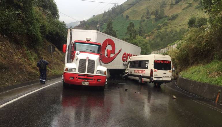 En el lugar un hombre y una mujer fallecieron y 16 personas entre ellas 3 niños y 13 adultos resultaron heridas las cuales se recuperan en hospitales de Ibagué y Cajamarca, tras la colisión de un vehículo afiliado a la empresa de servicio intermunicipal en la empresa Expreso Cafetero contra una tracto mula.