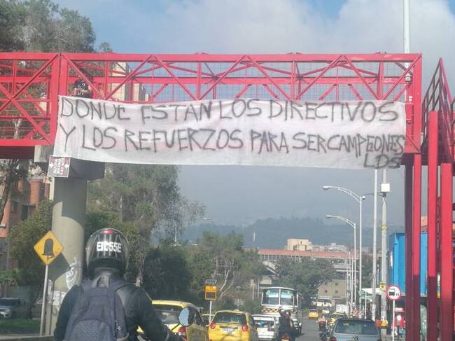 La barra instaló pancartas como forma de protesta por la falta de refuerzos en el equipo verde, en la avenida Oriental, centro de Medellín.