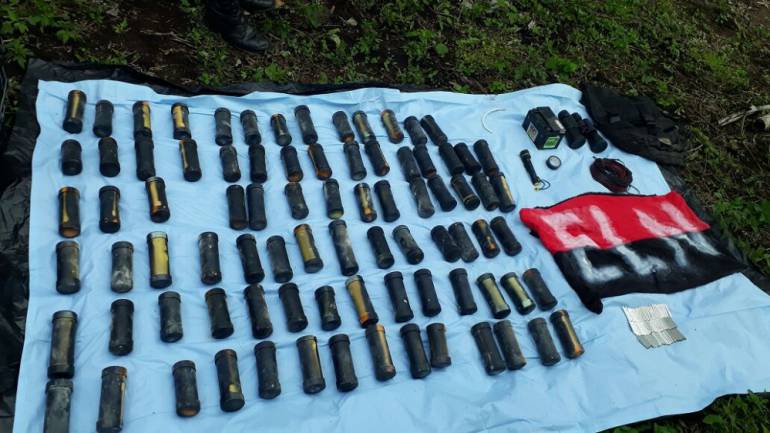 Las tropas del ejército halló 85 artefactos explosivos improvisados tipo tatuco, un lente binocular y una bandera del ELN, así como 80 detonadores.