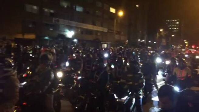 Luego de que en horas de la tarde se presentaran varios bloqueos simultáneos en varias zonas de Bogotá por cuenta de la protesta adelantada por cientos de conductores de moto, los motorizados se concentraron en inmediaciones del edificio de Caracol Radio para continuar con su manifestación.