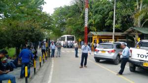 Unidades de la Policía Nacional regulan el tráfico de la Ruta del Sol a la altura de Puerto Boyacá, para evitar mayores traumatismos en la movilidad nacional, y acompañan la manifestación de los trabajadores.