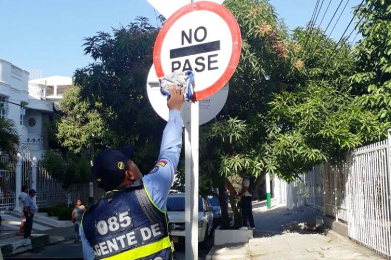 Agentes del Departamento Administrativo de Tránsito y Transporte de Cartagena se dieron a la tarea de recuperar las señales de tránsito en el barrio Santa Lucía que algunos vándalos han afectado cubriéndolas con pinturas, doblándolas y colocándole cualquier clase de objetos.