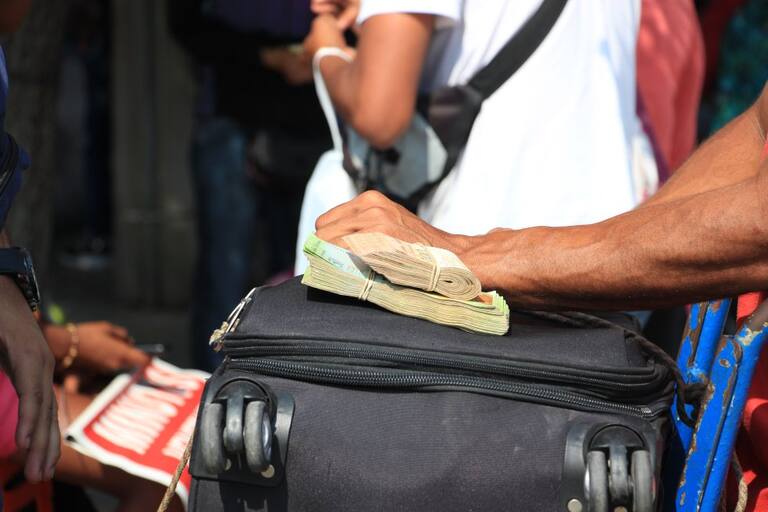 Un venezolano cuida sus fajos de bolívares: a pesar de la devaluación, son su único pasaporte para empezar una vida en Colombia.