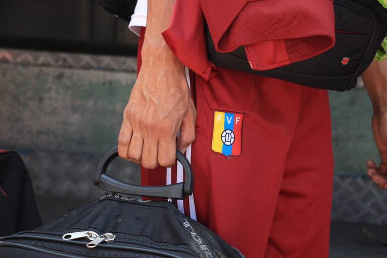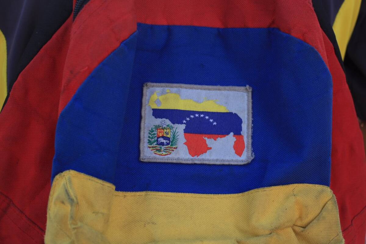 El escudo de armas de Venezuela, que simboliza la unión y la riqueza de la Nación, adorna la maleta de uno de los migrantes que, tras la crisis económica, abandona su país, rumbo a Colombia.