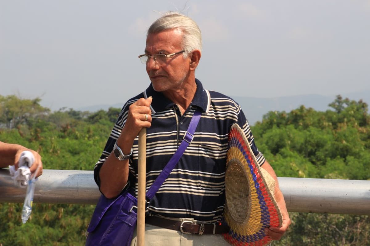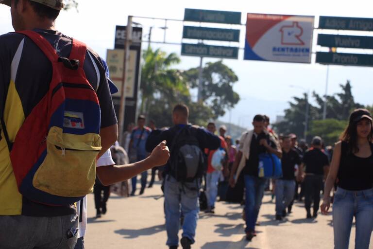 En la mitad del puente internacional Simón Bolívar, este venezolano cruza de una tierra tricolor a otra.