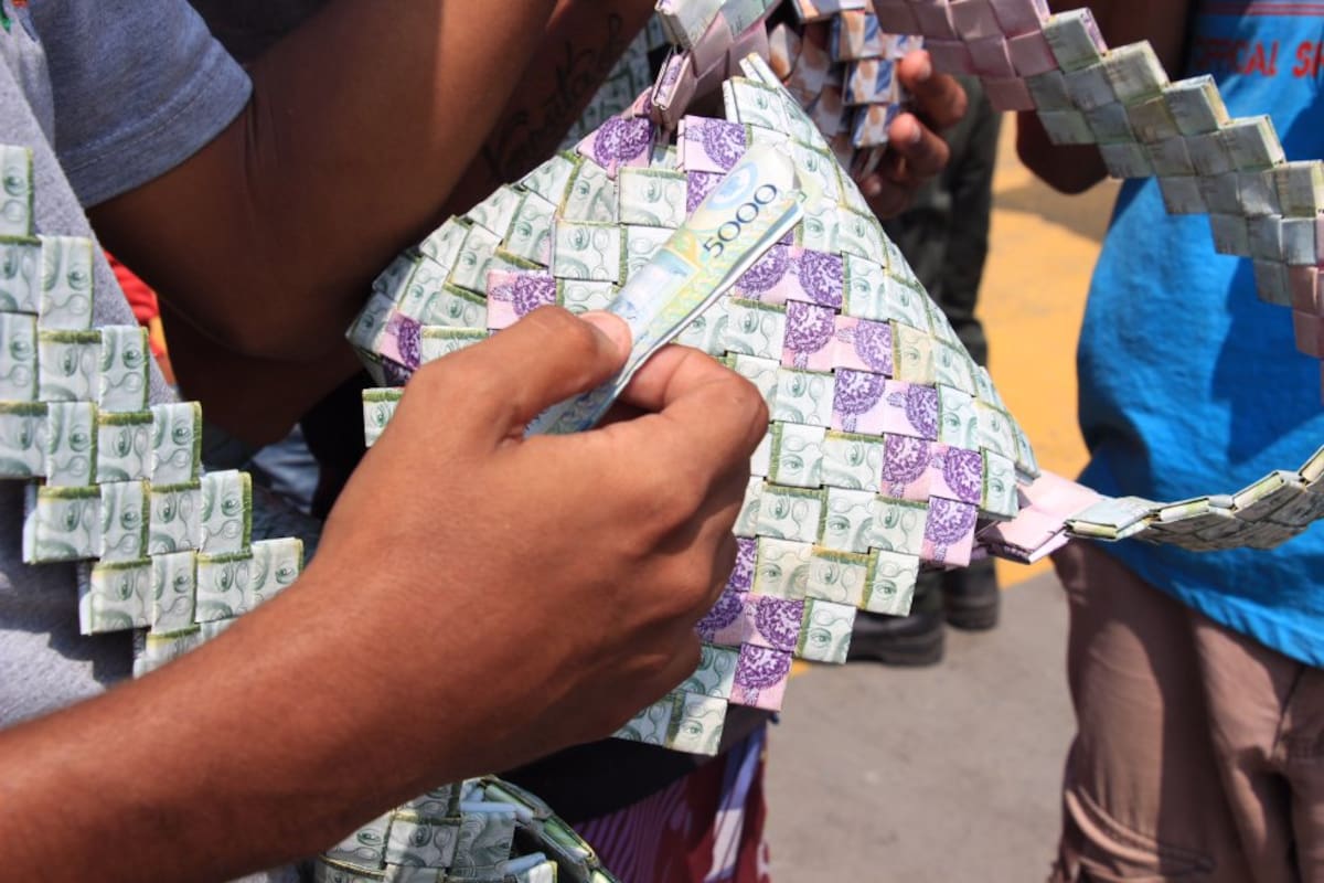 Frente a los ojos del educador Simón Rodríguez, un bolso hecho con billetes de 1.000 y 10.000 bolívares se vende por 5.000 pesos colombianos.