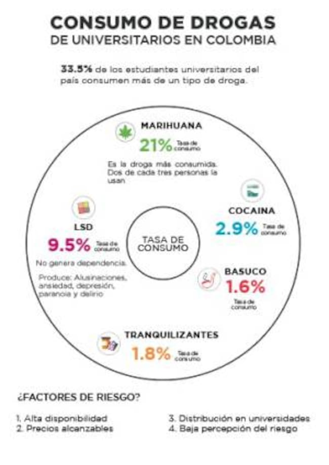 Según el estudio, Colombia tiene un problema mucho más grave de consumo de drogas en cuanto a universitarios se refiere, esto debido a varios factores de riesgo que afectan al país: la alta disponibilidad, los precios alcanzables, la distribución cercana a universidades y escuelas, y la baja percepción de riesgo.