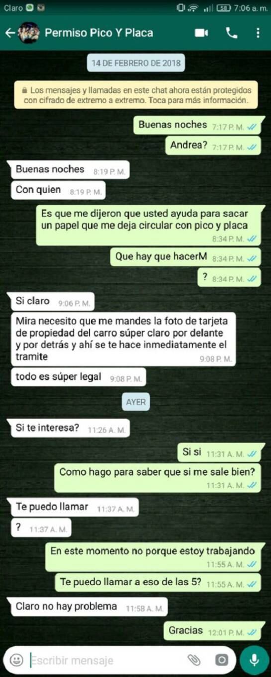 “Buenas tardes. Trabajo con la movilidad de Bogotá. Vendo los permisos para pico y placa. Es el documento con excepción por un año. Todo es completamente legal, con garantía”, dice una mujer en un audio que circula en los últimos días a través WhatsApp.