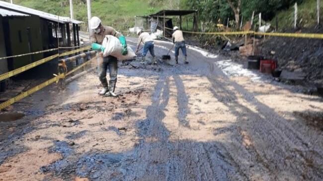 Se inició la limpieza de seis casas de la vereda que resultaron afectadas por el atentado; así mismo, en conjunto con el Invías se realiza labores de recolección de crudo en la vía La Soberanía.