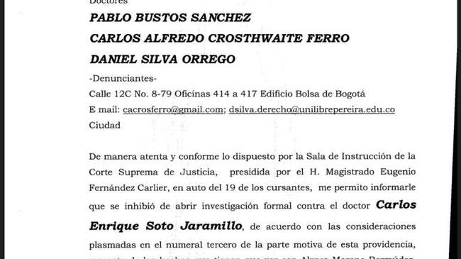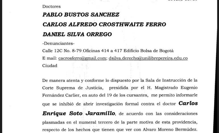 Según lo explicó Daniel Silva uno de los demandantes, la Sala Penal de la Corte Suprema de Justicia abrió investigación formal contra el ex Senador Carlos Enrique Soto Jaramillo, por los hechos ocurridos en torno a las certificaciones de cumplimiento de labores y pago de salarios a Juan David Giraldo Saldarriaga hijo de su pareja sentimental y miembro de su Unidad de Trabajo Legislativo, vinculado al Congreso de la República, mientras éste estaba fuera del país atendiendo asuntos personales y pese a ello el ex parlamentario certificó que había cumplido labores.