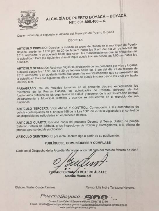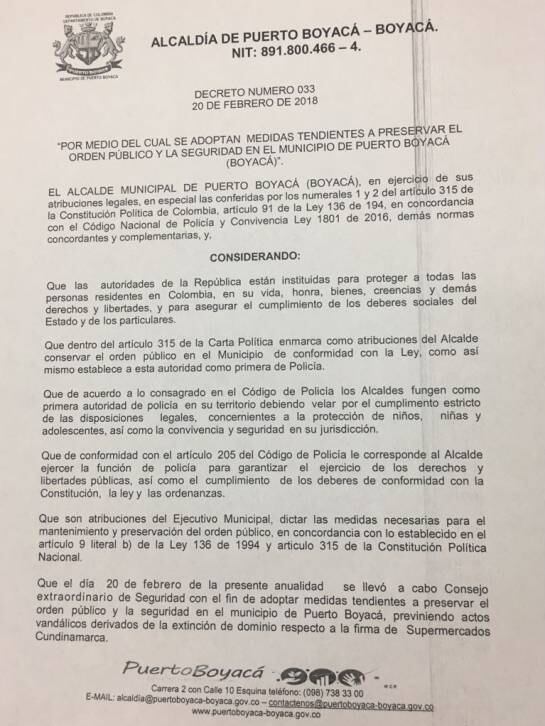 “Tras conocerse la noticia se programó un Consejo de Seguridad en el que suscribió el decreto 032 del 20 de febrero de 2018, “por medio del cual se reglamenta transitoriamente el horario de funcionamiento para el ejercicio de actividades económicas que involucren el expendio o consumo de bebidas alcohólicas y/o embriagantes en el municipio de Puerto Boyacá, además se acordó con la policía intensificar la seguridad en todo el sector comercial del municipio, y se realizó monitoreo constante de la movilidad en la zona urbana a través del apoyo de la Inspección de Transito”.