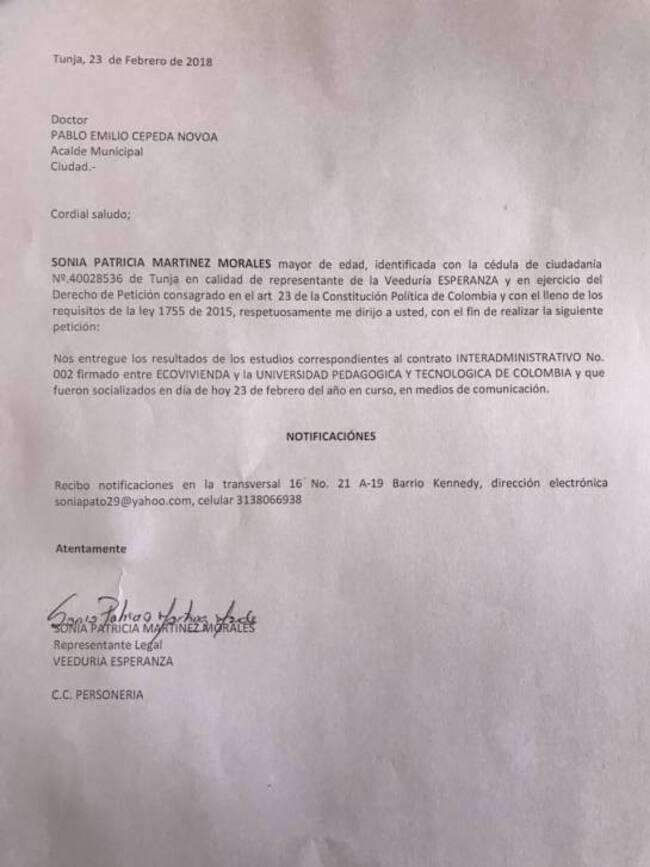 Por eso, con un derecho de petición, alrededor de las 100 personas que tendrán que evacuar dos de las 6 torres del proyecto Torres del parque en el occidente de Tunja, le exigen al alcalde de la ciudad y a la encargada oficial de la administración de vivienda municipal Ecovivienda, que les expliquen detalladamente los resultados obtenidos en el estudio y todas las garantías que tendrán sobre vivienda digna.