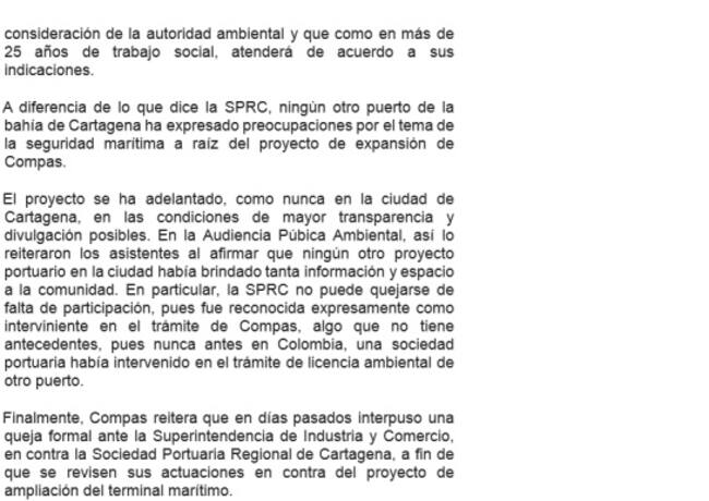 "El proyecto se ha adelantado, como nunca en la ciudad de Cartagena, en las condiciones de mayor transparencia y divulgación posibles. En la Audiencia Púbica Ambiental, así lo reiteraron los asistentes al afirmar que ningún otro proyecto portuario en la ciudad había brindado tanta información y espacio a la comunidad. En particular, la SPRC no puede quejarse de falta de participación, pues fue reconocida expresamente como interviniente en el trámite de Compas, algo que no tiene antecedentes, pues nunca antes en Colombia, una sociedad portuaria había intervenido en el trámite de licencia ambiental de otro puerto", dice el comunicado.