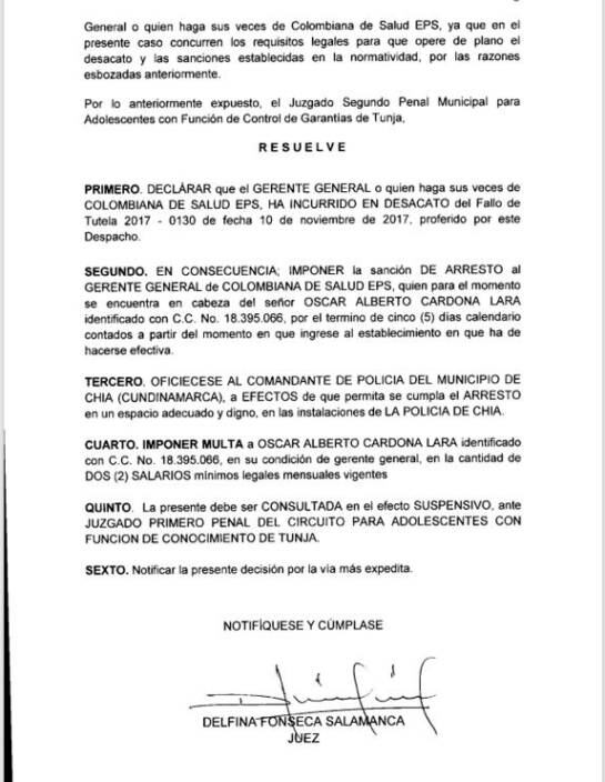 Al declarase el desacato, una juez impuso la sanción de arresto al gerente general de Colombiana de Salud EPS, Óscar Alberto Cardona Lara, por un término de cinco días calendario contados a partir del momento en que ingrese al establecimiento en que haya de hacerse efectiva la sanción.,