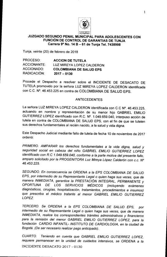 El fallo de tutela del juzgado para adolescentes con función de control de garantías de Tunja, resolvió el incidente de desacato de tutela promovido por la progenitora del bebé, la profesora Luz Mireya López Calderón, la cual amparó los derechos fundamentales del menor de edad residente en Duitama a la salud y a la vida digna.