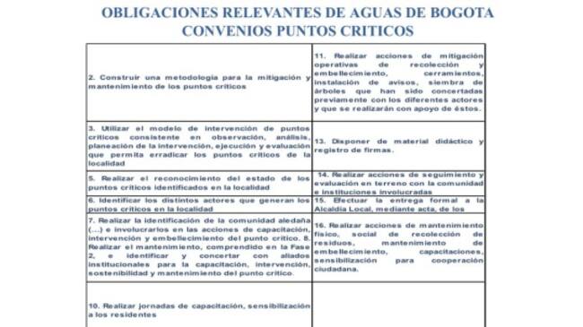 Este convenio se hizo entre los fondos de desarrollo local y Aguas de Bogotá para la atención de 101 puntos críticos que se detectaron en 10 localidades de la ciudad donde constantemente se acumulan los desechos mixtos (escombros, material aprovechable y orgánico) que produce la ciudad.