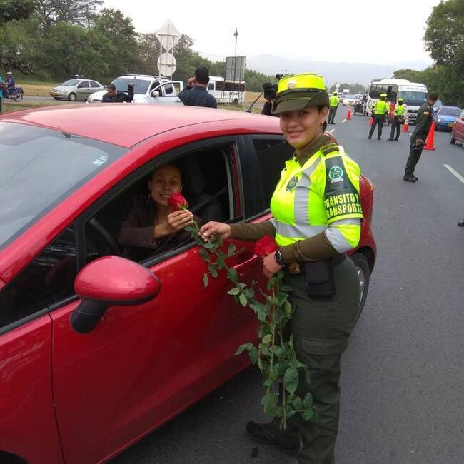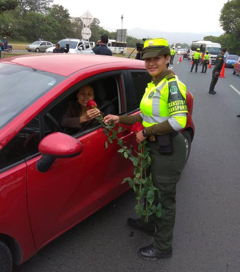 Cientos de rosas fueron entregadas desde tempranas horas de hoy por la policía del Valle en las carreteras del Valle a las viajeras durante el Día Internacional de la Mujer.