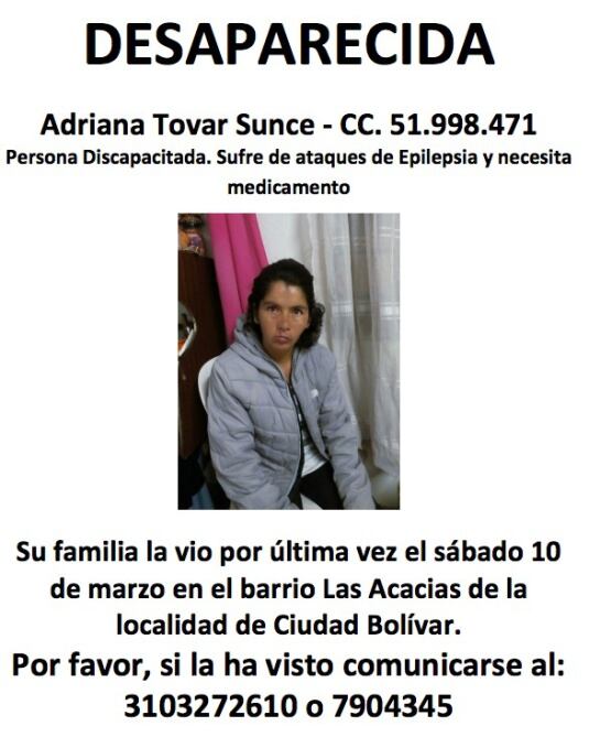 Su familia ha estado repartiendo volantes a lo largo de la ciudad en busca de su paradero, ya que Adriana Tovar sufre ataques de epilepsia y necesita tomar medicamentos.