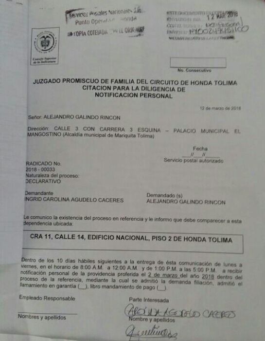 Ante el Juzgado Promiscuo de Honda, Tolima, fue elevada una demanda por alimentos y reconocimiento de paternidad contra el alcalde del municipio de Mariquita, Alejandro Galindo Rincón.