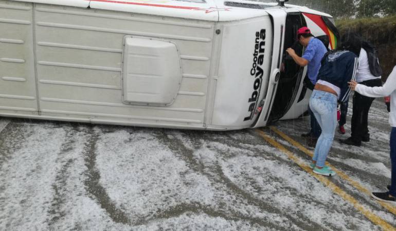 Mientras tanto en el corregimiento de Paletará, municipio de Puracé, al oriente del Cauca, una fuerte granizada hizo que el conductor de un bus de servicio público perdiera el control y se volcó dejando seis personales heridas, según reportan los organismos de socorro, que trasladaron a los afectados a hospitales de Coconuco y Popayán.